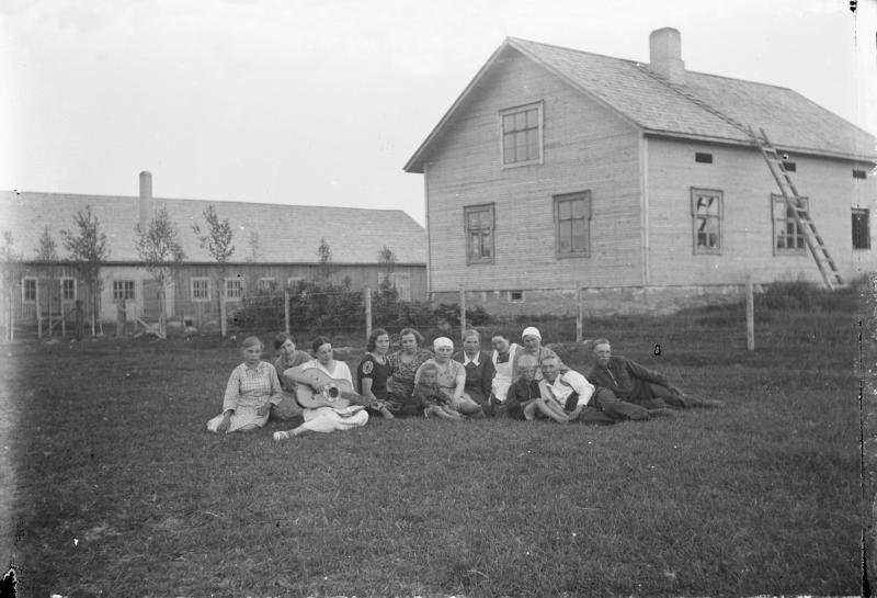 Kortesmäen talo. vas: Hilda Kortesmäki, Hilja Kuivasmäki, Mimma Katajamäki, Ellen Kortesmäki, Jenny Kortesmäki, Tyyne Kortesmäki, Pentti Kortesmäki, Helmi Kortesmäki, Ida Katajamäki, Mimmi Katajamäki, Pauli Kortesmäki, Jussi Kortesmäki sekä Alfred Jokinen.