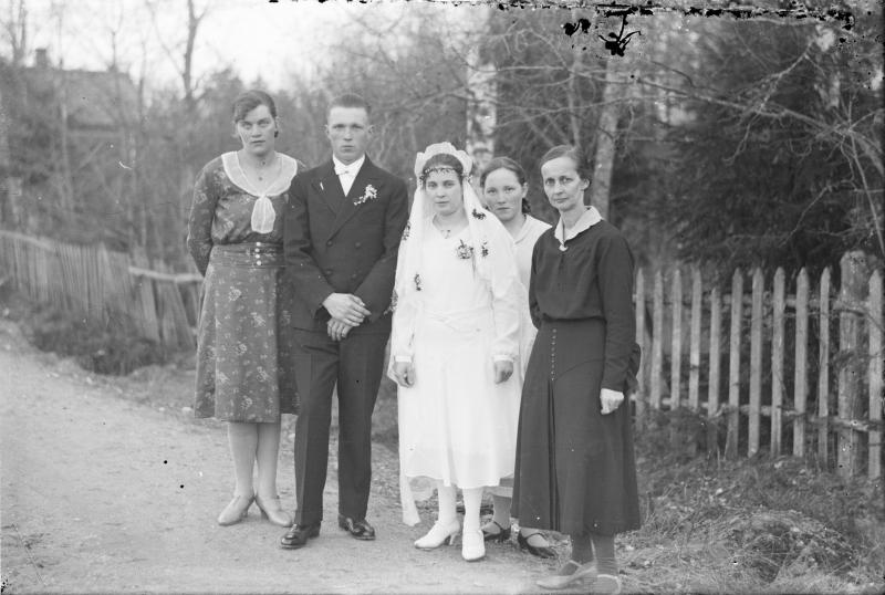 Juho Haapa-ahon ja Sandra Kanervan häät 15.10.1927. Vas. Anna Haapa-aho (Juhon sisar), Juho ja Sandra, Helmi Kanerva (kauppias Alex Kanervan puoliso), takana Saima Lehtomäki. Valokuvaaja Verner Vanhamäki