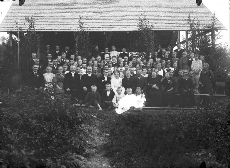 Lyyti Niemistön ja Matti Pennalan häät 21.8.1926. Morsiamesta toinen oik. Juho ja Sanna Takala. Takaloiden takana Aleksanteri ja Hilma Pennala. Valokuvaaja Heikki Heikkola