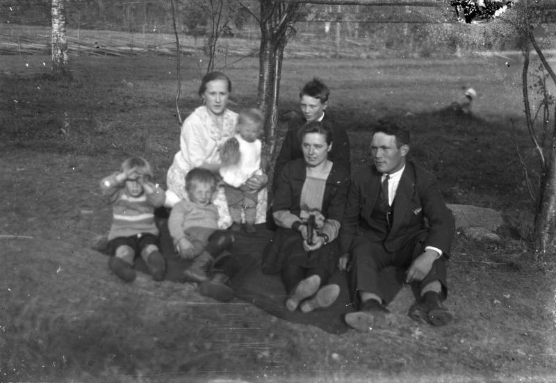 Impi Vilppula os. Lehtomäki, Veikko, Voitto, Veijo, Saini, Hanna Noros, oik. Juho Lehtomäki. Valokuvaaja Heikki Heikkola