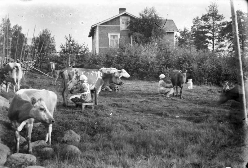Iida ja Vihtori Paavolan lehmät Vähtärin mäen alla. Vasemmalla sankarihauta, hautausmaa, kirkko. Kuvassa oleva rakennus on Töysän ensimmäinen kunnantalo. Valokuvaaja Heikki Heikkola