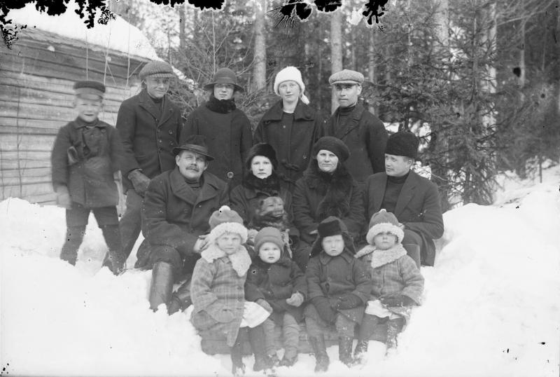 Takarivi vas. 1. Kari Kekoni, 2. Pauli Helin, 5. Heikki Heikkola. Keskirivi vas. 1. Urpo Kekoni, 2. Tyyne Mäkinen, 3. Tyyni Kekoni, 4. Kaarlo Mäkinen. Edessä vas. 1. Aili Kekoni, 2. Jaakko Mäkinen, 3. Pentti Kekoni, 4. Anna-Liisa Kekoni. Mäkinen Töysän aseman asemamies, Kekoni rautatien linjatarkastaja.