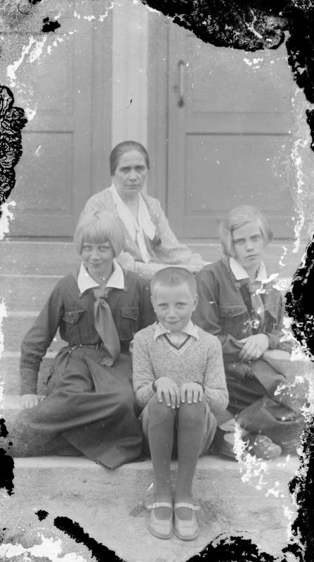 Fanni Koskimaa os. Ojanperä, Töysän kk:n koulun opettaja, kirjailija Juho Koskimaan puoliso, vas. Alma, Onni ja Lyyli Koskimaa. Tytöillä partiopuvut Valokuvaaja Verner Vanhamäki