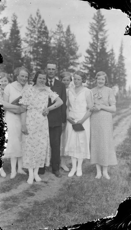 Kihlapari Impi Ylinen ja Matti Vannesluoma (Luoma) oik. Aini Kukkola, Anni Raiski, vas. Aino Kukkola, Aino Raiski. Valokuvaaja Verner Vanhamäki