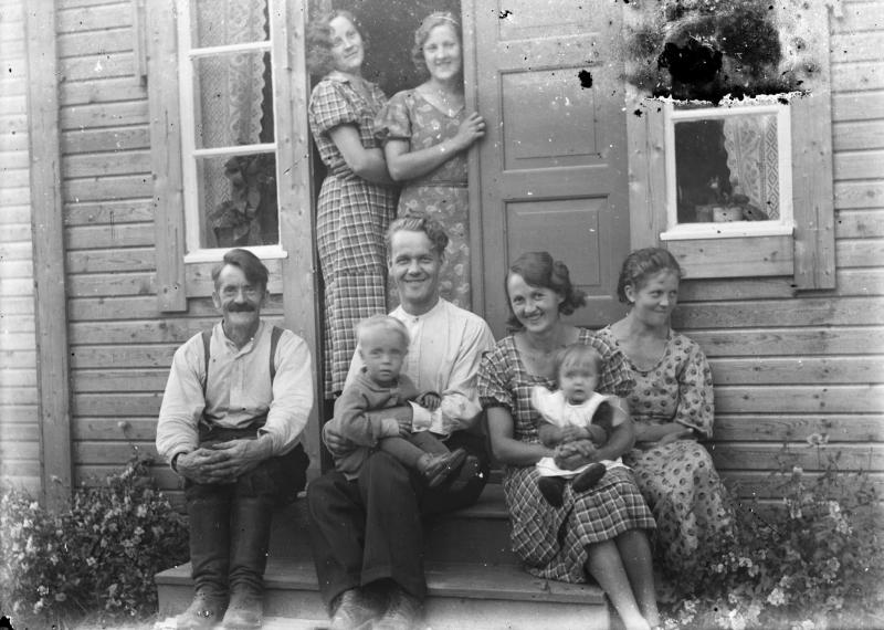 Jenny ja Laimi Isomäki, Salttu Isomäki, Virtanen Lauri ja Hilda os. Isomäki, Aili Jokinen os. Isomäki. Valokuvaaja Heikki Heikkola