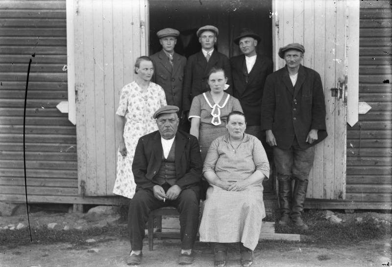 Edessä vas. Konsta (vanh) ja Selma Tyrni, heidän tak. Toini Tyrni - Koskenaho, Eemeli, Jalli nojaa ovea. Takana oik. Konsta Tyrni (nuorempi) + kolme serkkua Hämeestä. Valokuvaaja Heikki Heikkola