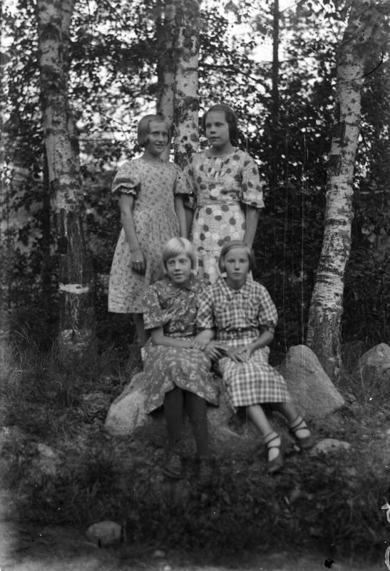 Airi Mäkelä - Juppo, Rauha Ojala - Kaasalainen, vas edessä Eila Ojala - Pitkä-Aho sekä Aino Vuorela - Meriläinen. Valokuvaaja Heikki Heikkola Kuvakoko 83x120