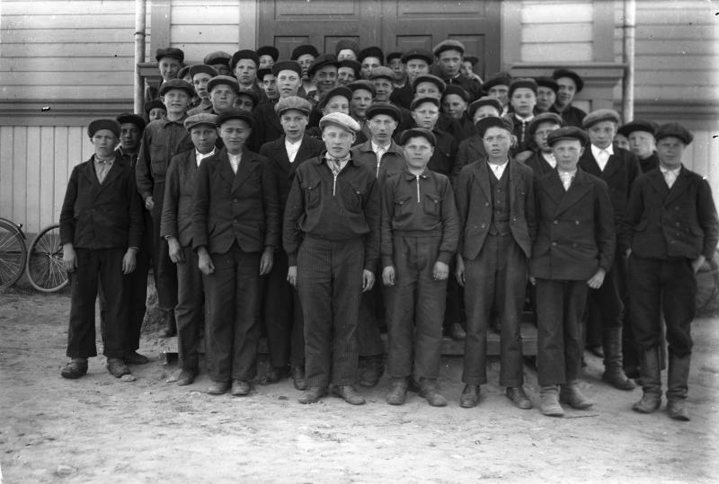Lauri Pesola, Toivo Hakojärvi, Sulo Einola, Oiva Katajamäki, Paavo Kleimola v.1920 synt. rippikoulupojat. Valokuvaaja Heikki Heikkola Kuvakoko 83x120