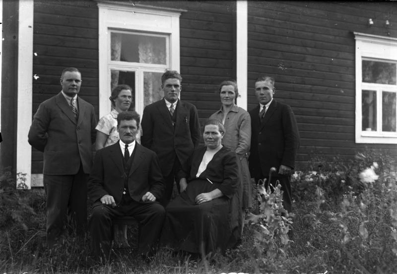 Edessä, Johannes ja Ida Myllymäki os. Vähämaa. vas. Matti ja Hilma Kilkanen, Eino Myllymäki, Vieno ja Jani Ala-Kitula. Valokuvaaja Heikki Heikkola Kuvakoko 83x120