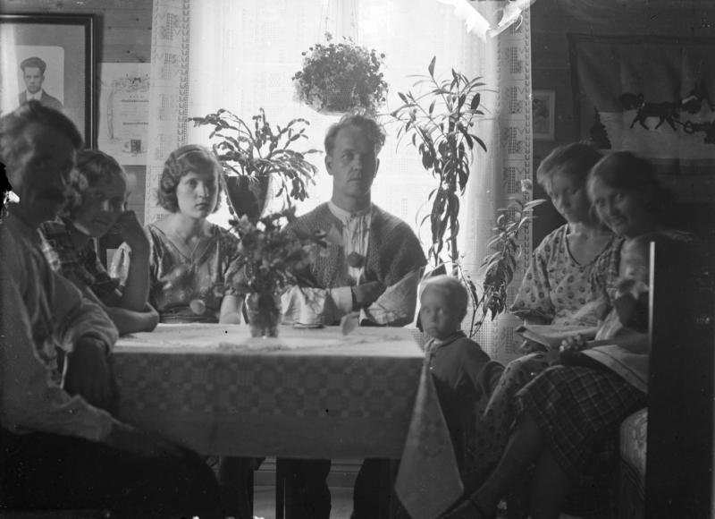 Pöydän takana Lauri Virtanen, oik. Hilda Virtanen os. Isomäki.