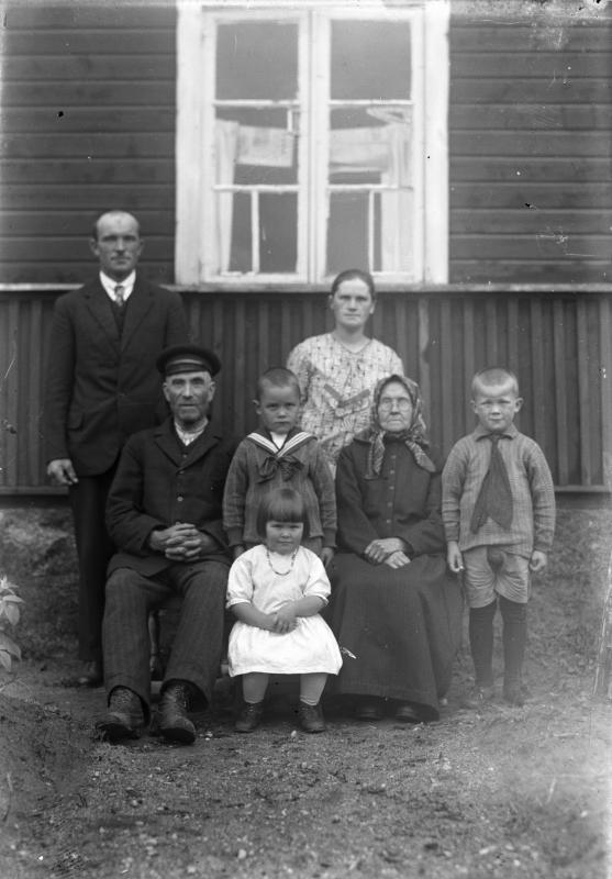 Takana Erkki ja Hilma Pohjala. Lapset Erkki, Eino ja Aino. Erkki Pohjalan vanhemmat Erkki ja Sanna Pohjala. Valokuvaaja Heikki Heikkola Kuvakoko 83x120