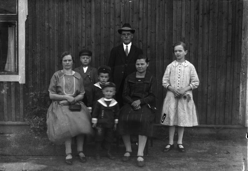 Vasemmalta: Elli Maria Eteläpää os. Heikkilä, Onni Olavi Heikkilä, Olavi Kustaa Eteläpää, Unto Johannes Eteläpää, Kustaa Heikkilä, Hilda Ahola os. Nikkari ja Hilda Kyllikki Heikkilä myöh. Ylä-Mikkola, Peltonen.