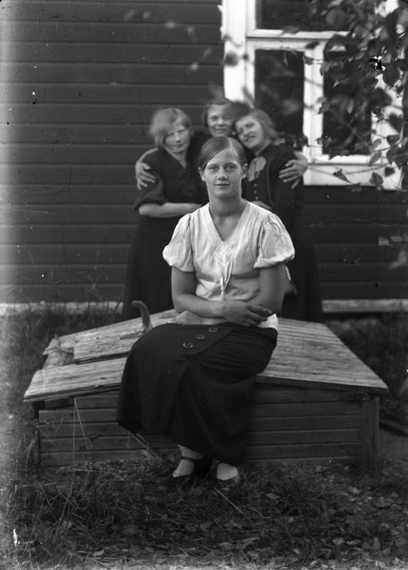 Vas. Aili Savolainen myöh. Hautamäki, Pykälämäki. Kesk. Toini Holkko myöh. Auraniemi, oik. Toini Holkko myöh. Hakala, Edessä Bertta Kuusela os. Peltoniemi. Valokuvaaja Heikki Heikkola Kuvakoko 83x60