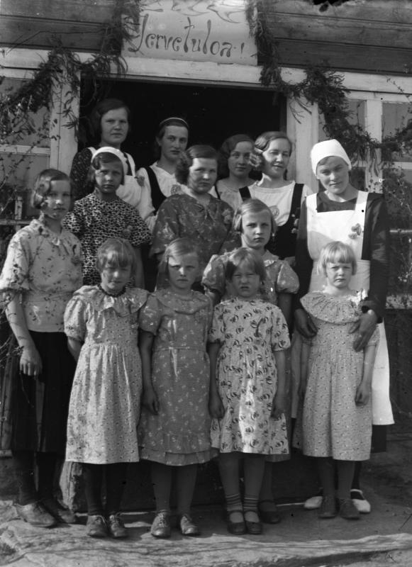 Edestä vas. Rauha Ruuhela - Hiipakka, Mirja Uusitalo - Korkeaniemi, Inkeri Lanttola - Katajamäki, Rauni Ruuhela - Ylimutka. Toinen rivi vas. Kerttu Ruuhela - Ylimutka, Saima Uusitalo - Vannesluoma. Kolmas rivi vas. Ilmi Loukasmäki - Keskinen, Aino Järvinen, Anna Haapa-Aho - Pennala. Takarivi vas. toinen Hilma Rantala - Sorila, Rankila. Kerttu Keisala - Mäenniemi, Saima Aho.