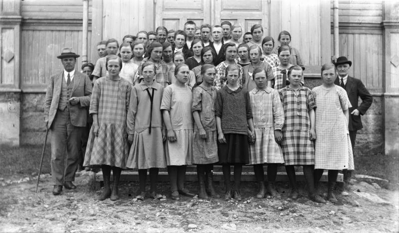 Khra Tuomola, kanttori Mattila, 2 rivi kesk. tumma Sonja Auraniemi, 2. tyttö oik. Alli Hakomäki, 1910 ja -11 syntyneitä. Töysän srk:n rippikoulu v. 1926. Valokuvaaja Heikki Heikkola Kuvakoko 83x135