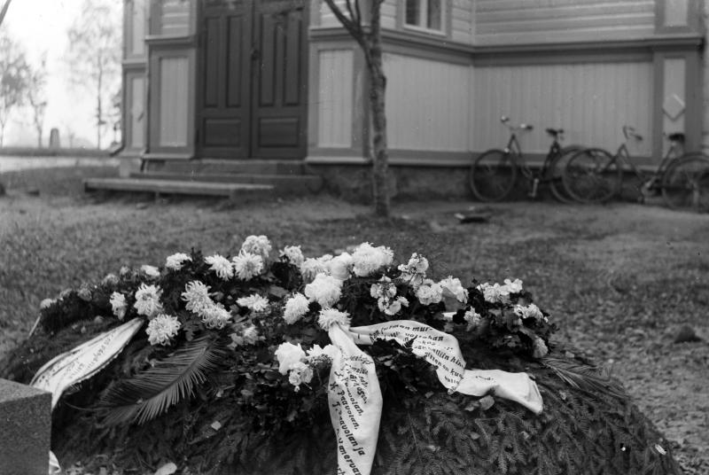 Herralan hautakumpu. Nauhassa naapurien nimet: Suomelat, Härköset, S.K-Y.,Paavolat ja Kanervat. Valokuvaaja Heikki Heikkola Kuvakoko 77x120