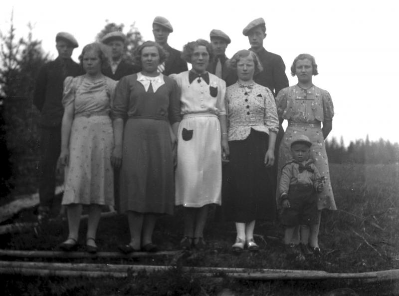 Takana vas. Tauno Savolainen, Elias Hautamäki, Toivo Savolainen, Tauno Peltonen ja Matti Pykälämäki, edessä vas. Vieno Koivisto, Toini Dagmar Holkko nyk. Auraniemi, Anna Savoilainen myöh. Hautamäki, Aili Hautamäki myöh. Pykälämäki ja Toini Susanna Holkko nyk. Hakala, pikkupoika edessä Tarmo Peltonen