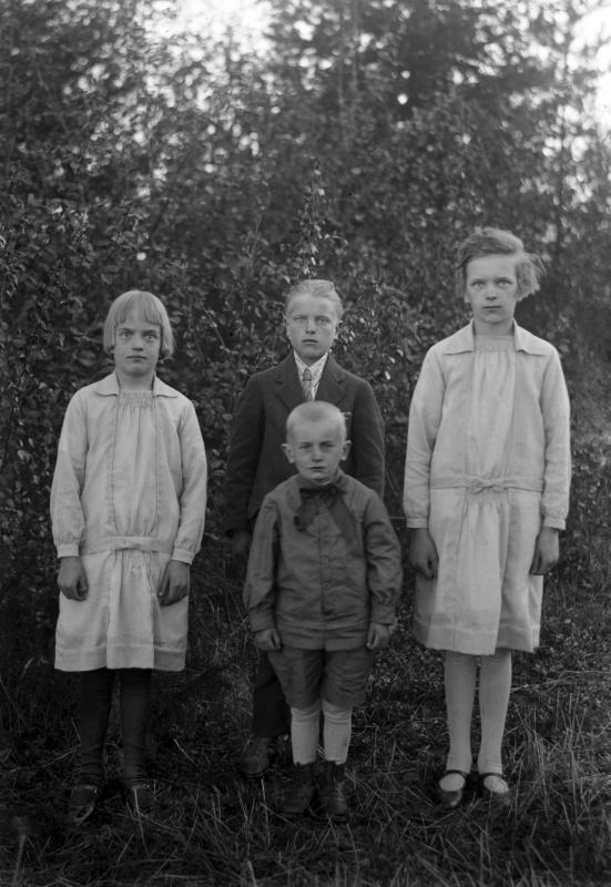 Vasemmalta: Aili Irma Esteri Heikkilä, Onni Olavi Heikkilä, Unto Johannes Eteläpää (edessä) ja Hilda Kyllikki Heikkilä myöh. Ylä-Mikkola, Peltonen. Kuva otettu n. vuonna 1928. Valokuvaaja Heikki Heikkola Kuvakoko 83x120