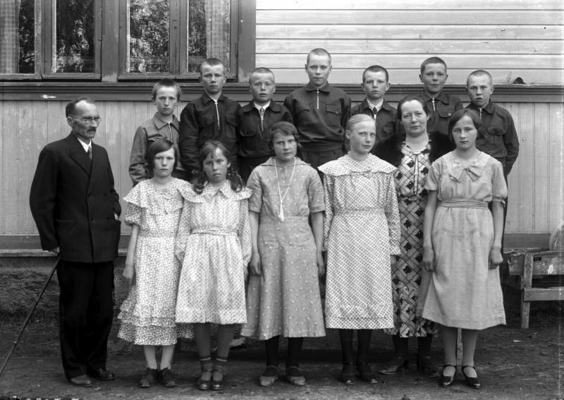 Töysän kirkonkylän kansakoulun oppilaita. Vas. opet. Juho Hakala ja oikealta toinen opet. Aino Åkerman Valokuvaaja Heikki Heikkola Kuvakoko 83x120