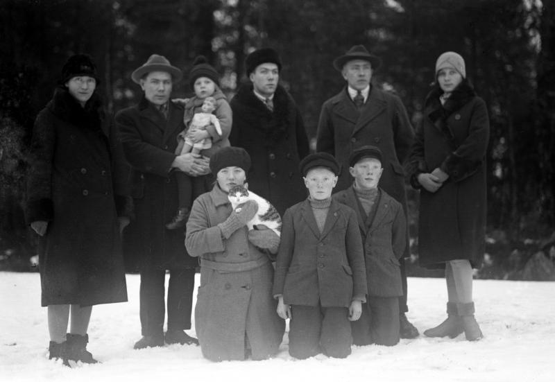 vas. takaa Hanna ja Arvo Jokela, tytär Toini sylissä, Tauno Jokela, Artturi ja Bertta Jokela, edessä vas. Kerttu Jokela, myöh. Väliaho, Paavo ja Alpo Jokela Valokuvaaja Heikki Heikkola