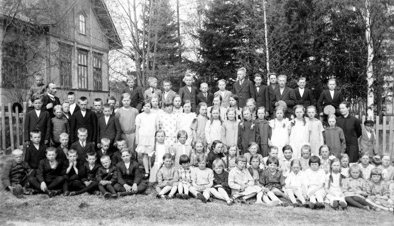 Töysän kirkonkylän kansakoulun oppilaita, vas. Opettaja Juho Hakala ja oik. opettaja Aino Åkerman Valokuvaaja Heikki Heikkola