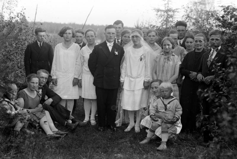 Aarne Kilkasen ja Hilma Lehtomäen häät 15.6.1929. Vas. takana Arvo Kilkanen, Aarne veli. Oikealla takana Juho Lehtomäki. Valokuvaaja Heikki Heikkola