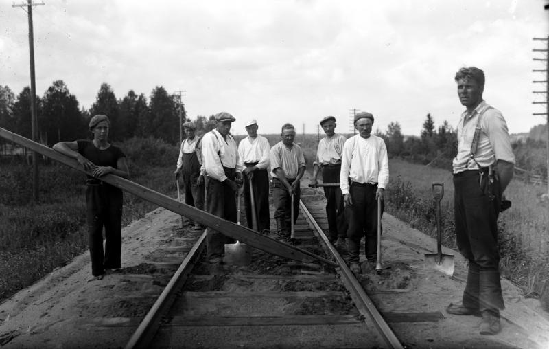 Topparoikkaporukka Töysän aseman ylikäytävän kohdalla. Ratavartija Uljas Vaajamo oikealla. Valokuvaaja Heikki Heikkola