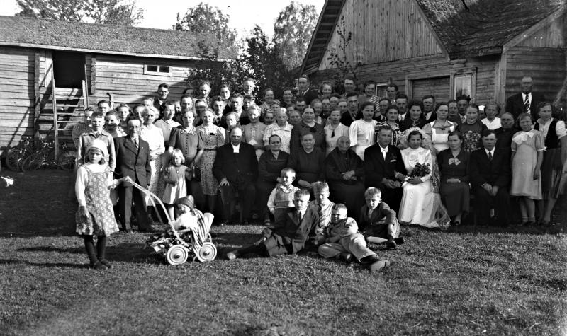 Armas Vihtori Peuralan ja Saila Maria Mustaniemen häät 24.6.1945. Morsiamen oikealla puolella Heikki Vihtori Peurala ja Jenny Eliisa Peurala os. Saarimäki. Armas oli Heikki Peuralan ensimmäisestä avioliitosta, äiti Lyydi Peurala os. Yhtiö.