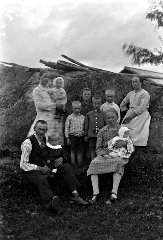 Edessä Erkki ja Elli os. Savolainen lapset Olavi ja Bertta Ristimäki. Kesk. Tak. patukkapää. Rauha Lahtela os. Lahti Valokuvaaja Heikki Heikkola