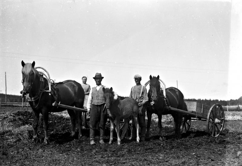 Vas. Maija Hakomäki, Jussi Hakomäki, Vihtori Isoaho, hevoset valakka Liisa ja varsa Valokuvaaja Heikki Heikkola