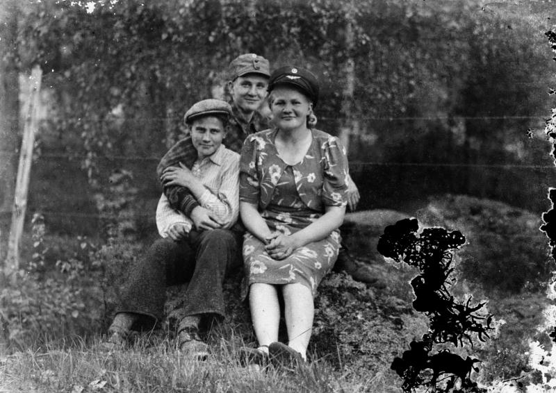 Veijo Vilppula, Veikko Vilppula ja Aino Jokinen. Aino Jokinen oli Töysän aseman kirjuri, junanlähettäjä Valokuvaaja Heikki Heikkola Kuvakoko 83x60