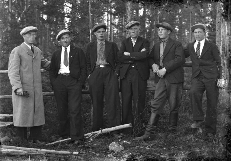 Hakojärveläisiä nuoria miehiä 1937. Vas. Usko Mäkiranta, Sulo Katajamäki, Reino Erkkilä, Paavo Jokela, Aukusti Katajamäki. Oiva Katajamäki Valokuvaaja Heikki Heikkola Kuvakoko 83x60