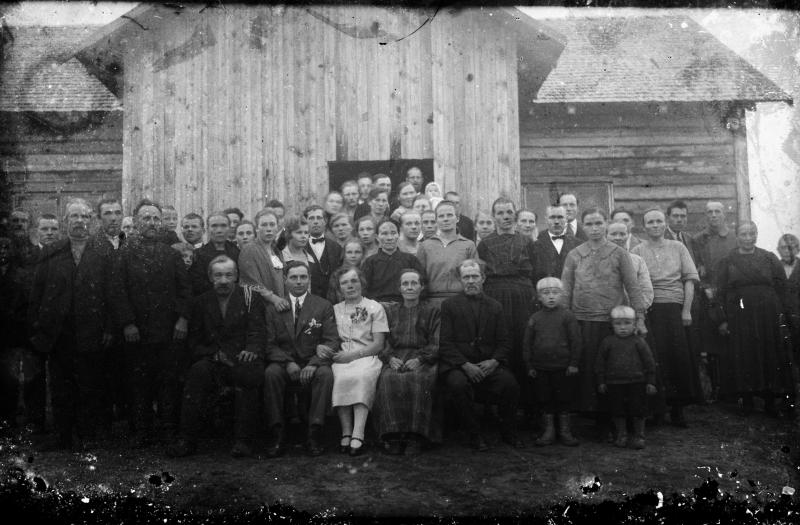 Kuvassa mm. Heikki Lehtomäki toinen vas. seisomassa. Kaisa Lehtomäki morsiamen takana seisomassa. Arvo. Lempi. Veikko Panula, Aleksi Panula Valokuvaaja Heikki Heikkola