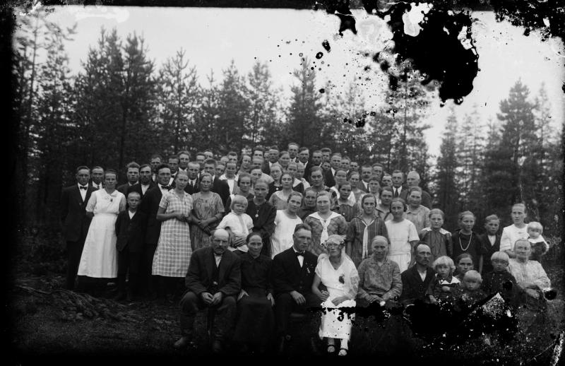 Vihtori Luoma ja Fanny Lehtomäen häät 1926. Morsiamen vieressä Miina Luoma os. Paavola, Heikki Lehtomäki, Lempi Panula ja pojat Veikko ja Arvo. Sulhasen vieressä Kaisa Lehtomäki os. Valtee, Juho Luoma. Taustalla mm. Lehtomäen, Jokelan, Saarimäen perheitä.
