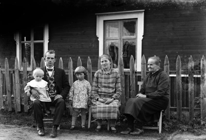 Matti ja Lempi (os. Korkeamäki) Tuovila, sylissä Rauha ja keskellä Meeri. Oikealla Lempin äiti Maria Ottilia Korkeamäki, os. Mäki. Valokuvaaja Heikki Heikkola