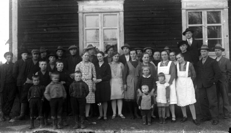 Töysän Sos.dem. työväenyhdistyksen jäseniä ja johtohenkilöitä työväentalon edustalla. Valokuvaaja Heikki Heikkola