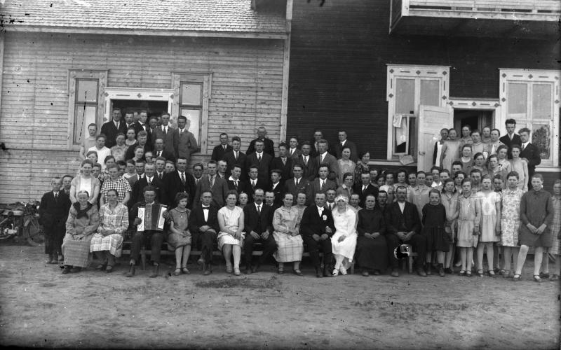 Haitarinsoittaja oik. Impi Pakkala, Matti Välkky, Ruusa Haveri, Valentin ja Hilma Myllymäki, morsiuspari Reino ja Heidi Kosola, Hilda ja Nestori Kosola, Ruusa, Jenny, Arvo ja Hilma Uusimäki, Väinö Ala-Mutka, Vieno Hepojoki, Toimi Kosola, Reino Kosola ja Heidi Välkky 25.5.1029
