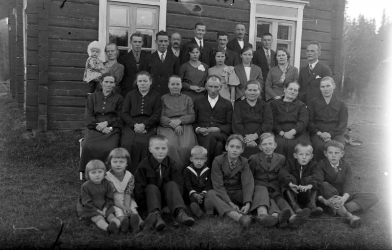Edessä vas. Leo Rasi myöh. Rintala, Mirja Rasi myöh. Mäkelä, Keijo Rasi, Veikko Arimo ja Kauko Hirvi, Ahti Rasi, Unto Onnela, Toinen rivi vas. Maria Onnela, Anna Rasi os. Reland, Juho Kustaa Rasi, Iida Johanna Myllymäki os. vähämaa, Anni Rajala os. Nakkari. Tak. Enni Rasi sylissä Hilda Rasi, Matti Rasi, Erkki Onnela, Matti Rajala, Matin edessä Helvi ja Irja Onnela, Alli Hirvi os. Rasi ja Jussi Hirvi. Takana oik. Väinö Harju, Johannes Nikodemuksen poika Myllymäki
