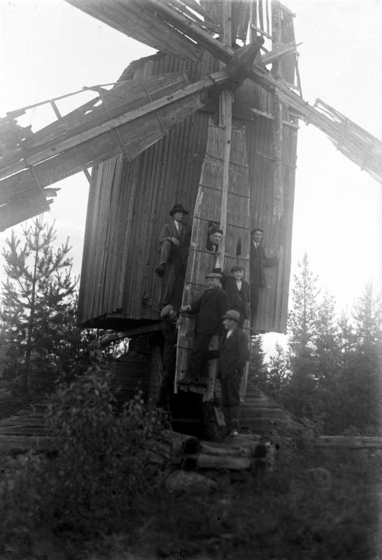 Kortesmäen tuulimylly Hakojärvellä, purettu. Miehet: Onni Lamminaho, Vihtori Katajamäki, Verner Vanhamäki, Juho Järvinen, Toivo Lamminaho ja Juho Lamminaho Valokuvaaja Heikki Heikkola Kuvakoko 83x120