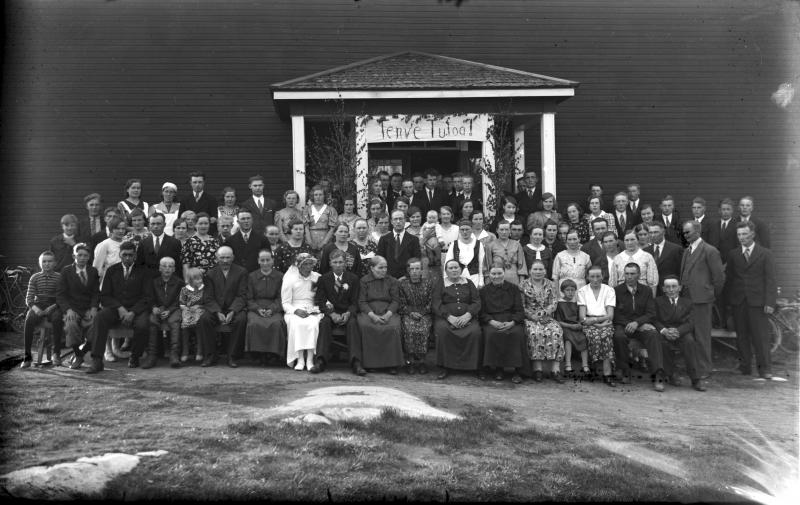Morsiamen vasemmalla pulella Oskari ja Fiia Myllyaho, kolmas vasemmalta Teemu Vanhamäki. Oikealla penkillä istuu Valde Pennala. (sulhanen Myllyahon poika) oikealta takarivissä kuudes mies Paavo Jokela. Kuvassa mm. Myllyahon, Yhtiön, Haaviston, Lahtisen ja Lamminahon ihmisiä