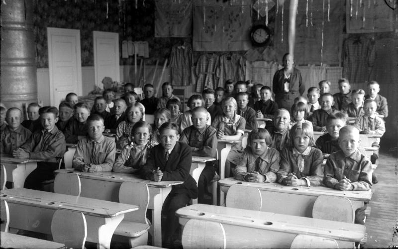 Töysän aseman kansakoulun oppilaita luokassa. Taustalla oppilaiden käsitöitä. Opettaja Sally Taimio os. Lehtonen Valokuvaaja Heikki Heikkola Kuvakoko 100x150