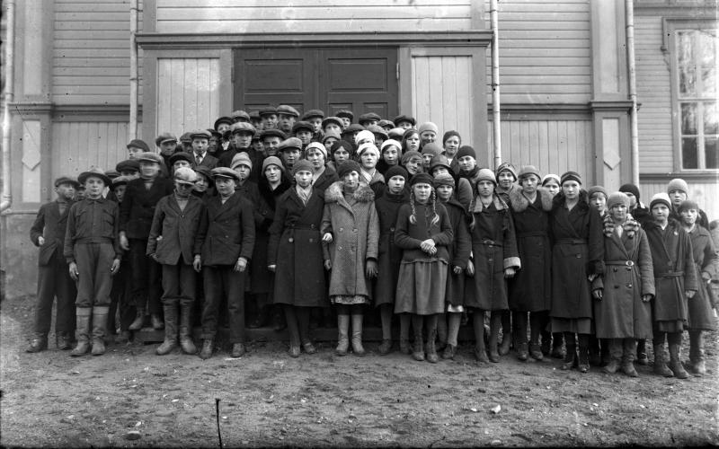 Rippikoululaisia kirkon edessä
