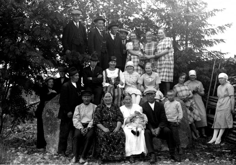 Edessä vas. istuvat Aleksi ja Liisa (os. Tanelintytär Ylimäki) Saarimäki, vas. nojaa kiveen Vihtori Katajamäki, vas. seisoo kiven etupuolelle Juho Lamminaho, hänen oikealla puolella ylempänä Onni Mäkiranta, hänen vieressään Fanni Kuivasmäki (myöh. Alava), Mäkirannan tytär, kolmas oikealta Hilma Ekola, vas. ylhäältä Kallioniemi, Aarno Ylimäki, Juho Järvinen, Matti ja Helmi (os. Vuorisalmi) Saarimäki.