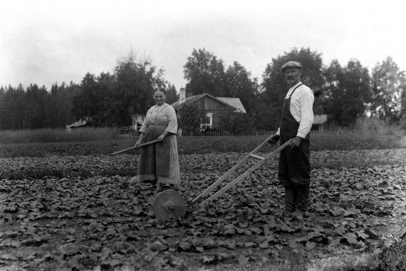 Hilda os. Heikkola ja Juho Vilppula turnipsimaata harventamassa ja perkaamassa. Kuvassa näkyviä samanlaisia perkauskoneita oli maamiesseuroilla yhteiskäytössä. Valokuvaaja Heikki Heikkola