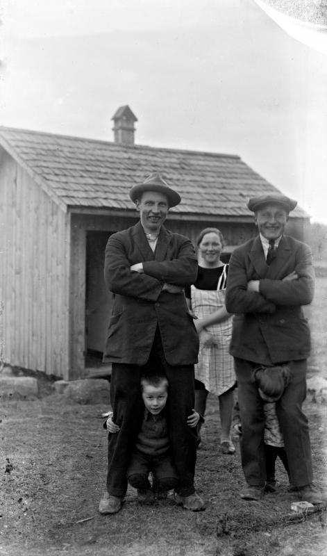 Matti Heikkola, Einari Vilppula, takana Impi Vilppula (os. Lehtomäki), lapset?. Impin saunan edessä. Valokuvaaja Heikki Heikkola