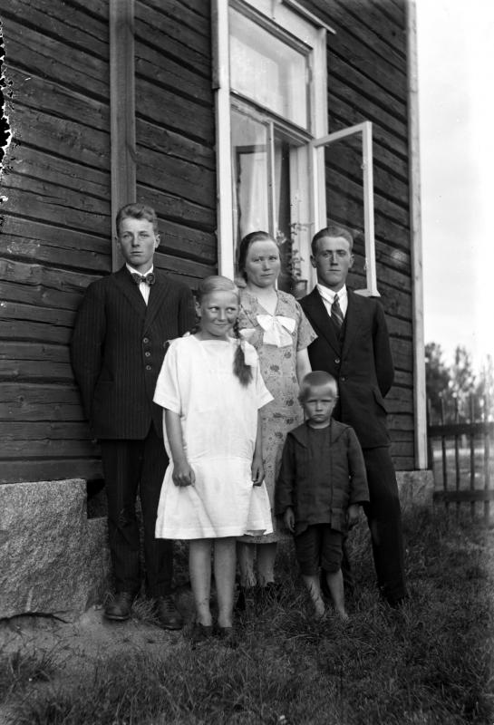 Takana vas. Arvo Raiski, Elli Raiski, Reino Raiski, edessä Aino Raiski (myöh. Pyylampi), Vilho Raiski Valokuvaaja Heikki Heikkola