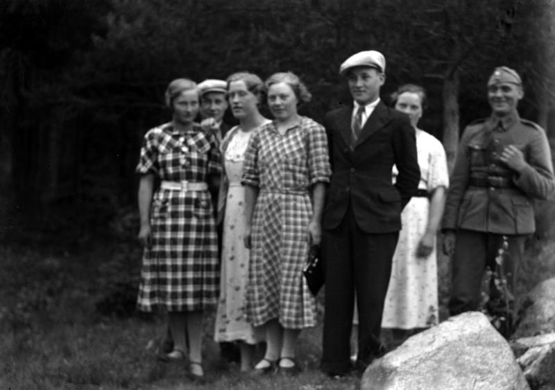 vas. Lempi Hakomäki nyk Vilmilä, Eero Aho, Hilda Uusitalo, Meeri Hakomäki, Eero Alanko, Saima Hakomäki, Reino Ylä-Hakomäki Valokuvaaja Heikki Heikkola