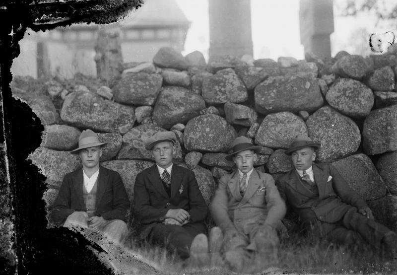 "Reino Järvinen, Kalle Riihimäki, Eino Niemi, Salomon "Salttu" Viitala", Töysän kirkon kivimuurin vieressä Valokuvaaja Verner Vanhamäki
