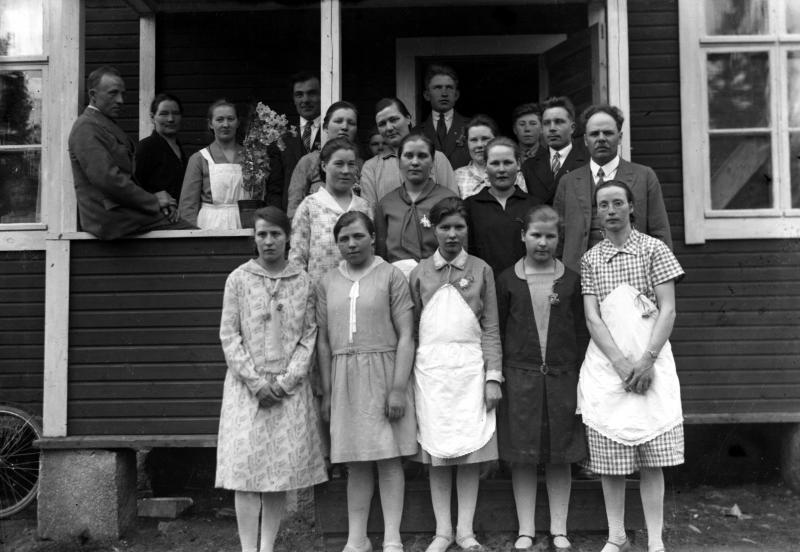 Kuvassa mm. Jussi Järvinen, Iida Katajamäki, Elsa Korkeamäki, Aleksi Katajamäki, Helga Kortesmäki, Vihelmiina Katajamäki, Eino Myllyaho, Sennu Mäkiranta, Usko Mäkiranta, Vihtori Erkkilä, Väinö Tuomola (Kirkkoherra), Iida Hakola, Hulda Kortesmäki, Iida Saarimäki ja Elli Hakola
