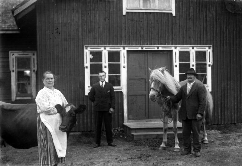 Vas. Aleksandra Holkko os. Salo, Seijari-lehmä, Eino Holkko, Lotta-hevonen, Juho Holkko Valokuvaaja Heikki Heikkola